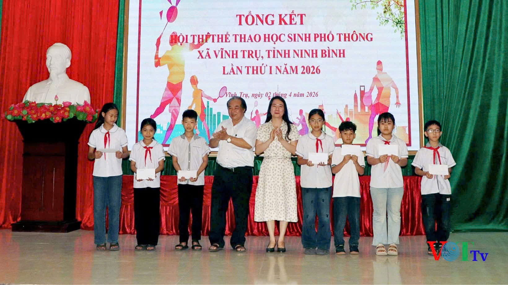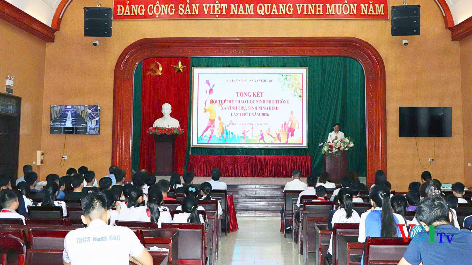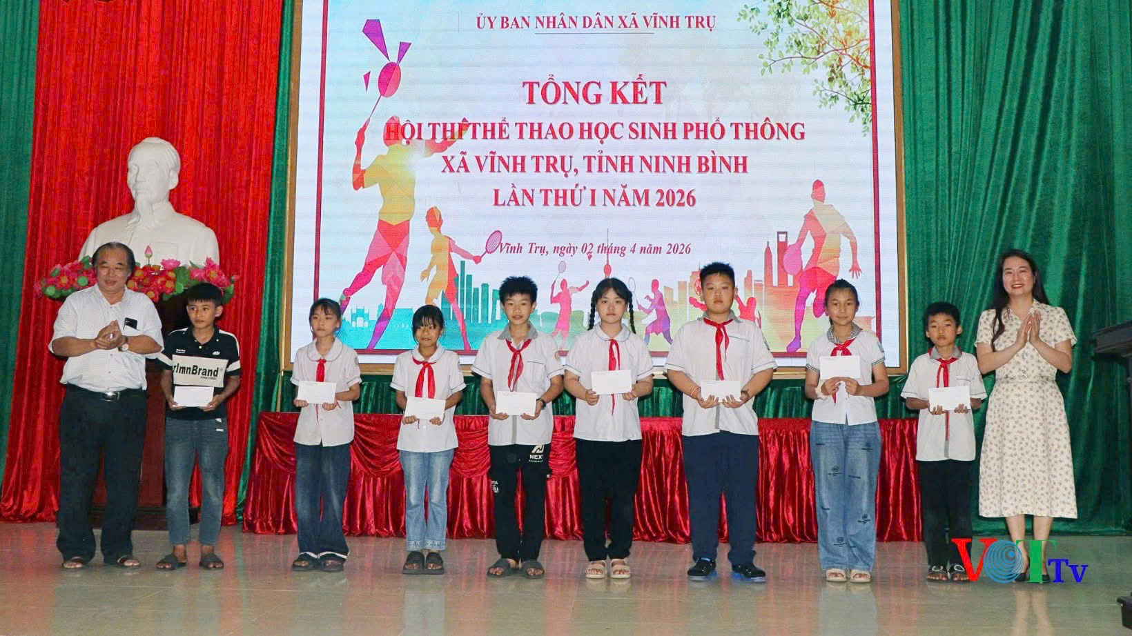 Chiều 2/4, UBND xã Vĩnh Trụ tổ chức tổng kết Hội thi thể dục, thể thao học sinh phổ thông xã Vĩnh Trụ, lần thứ I, năm 2026. Dự hội nghị có đồng chí Nguyễn Kim Cương – Phó Chủ tịch UBND xã; lãnh đạo phòng Văn hóa – Xã hội xã; Cán bộ quản lý các trường Tiểu học, Trung học cơ sở trên địa bàn xã và các em học sinh đạt thành tích cao tại Hội thi. Hội thi thể dục thể thao học sinh phổ thông xã Vĩnh Trụ, lần thứ I năm 2026 được tổ chức ở cả hai cấp học: Tiểu học và Trung học cơ sở, với sự tham gia tích cực của học sinh các nhà trường trên địa bàn. Cấp Tiểu học, được tổ chức 4 môn thi đấu với 12 nội dung, cấp Trung học cơ sở được tổ chức16 nội dung thi đấu. Các nội dung thi đấu phong phú, đa dạng, từ điền kinh, cầu lông, bóng bàn đến cờ vua, góp phần nâng cao chất lượng phong trào thể dục thể thao trong nhà trường, thu hút trên 100 vận động viên tham gia, tạo không khí thi đua sôi nổi, hào hứng. Các vận động viên đã thi đấu với tinh thần đoàn kết, trung thực, cao thượng. Tại hội nghị tổng kết, Ban Tổ chức đã trao các giải thưởng cho các vận động viên đạt thành cao tại Hội thi, đồng thời lựa chọn những vận động viên xuất sắc nhất để thành lập đội tuyển của xã tham gia thi đấu cấp Tỉnh trong thời gian tới. Thông qua hội thi nhằm đẩy mạnh phong trào rèn luyện thân thể theo gương Bác Hồ vĩ đại, thường xuyên tập luyện và thi đấu các môn thể thao trong nhà trường nâng cao sức khoẻ, tầm vóc, thể chất cho học sinh trên địa bàn xã.
